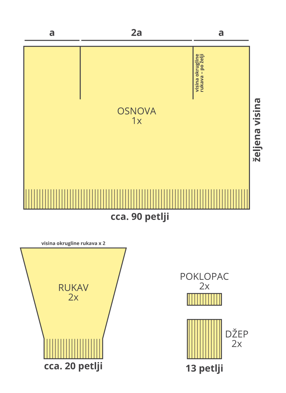 Kardigan je izrađen od Puffy pređe i ugrubo rečeno, sastoji se od tri dijela, osnove, rukava i džepova. Svaki dio možemo sastaviti zasebno, a zatim ih spojimo i stvorimo cjelinu.