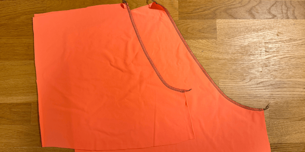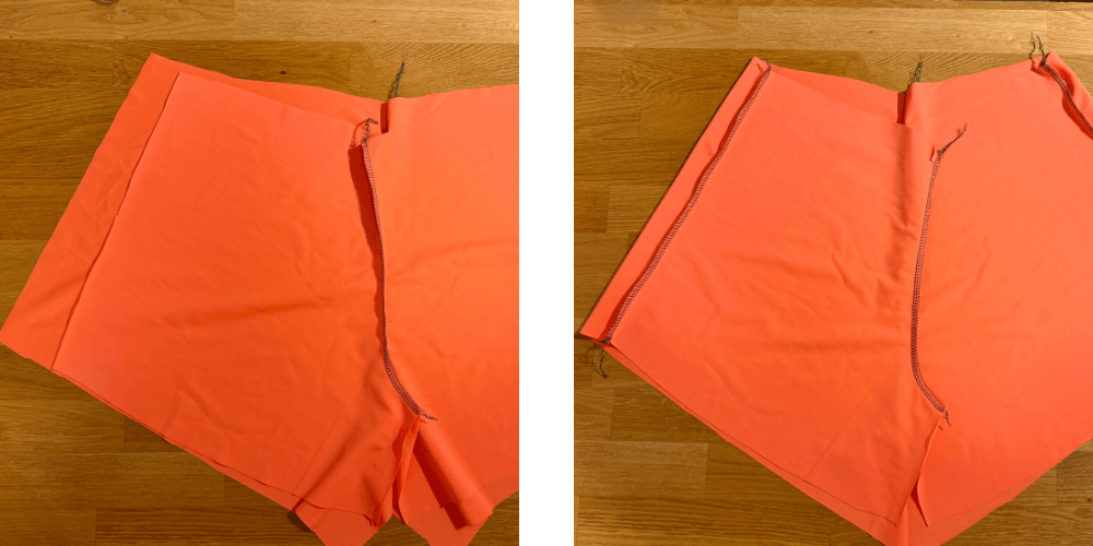 Prednje dijelove složimo lice na lice i zašijemo spojni šav (overlock ili elastični/cik-cak šav). Isto ponovimo i na stražnjem dijelu.