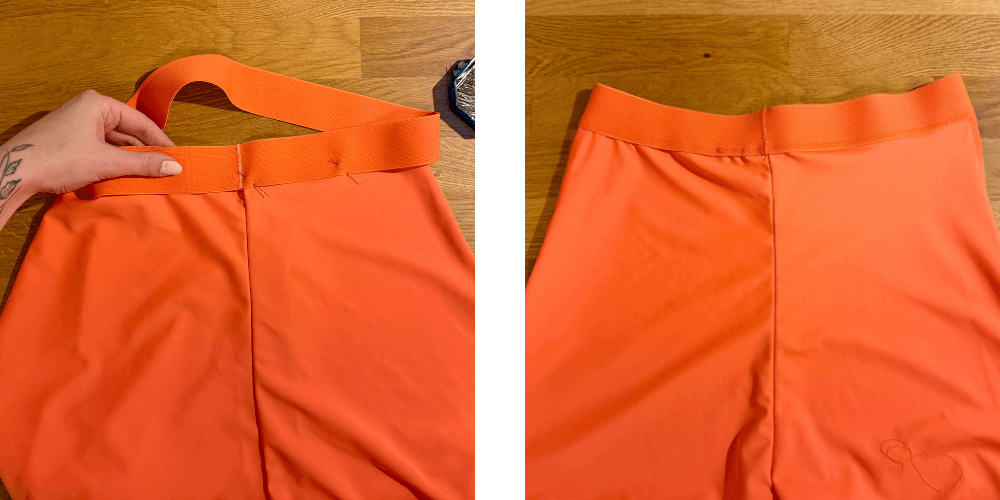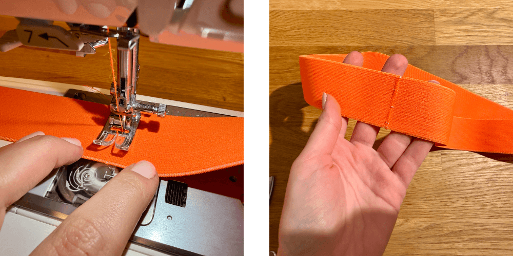Elastiku za struk izmjerimo prema opsegu struka, spojimo cik-cak šavom, a zatim ravnomjerno prišijemo na struk.