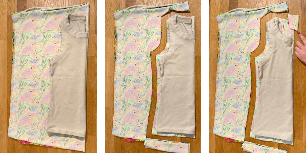 Tkaninu preklopimo na četvrtinu (1/4). Na pregib položimo majicu preklopljenu na polovicu i ocrtamo je. Kod rezanja dodamo 1 cm dodatka za šav. Na prednjem dijelu dodatno oblikujemo izrez oko vrata.