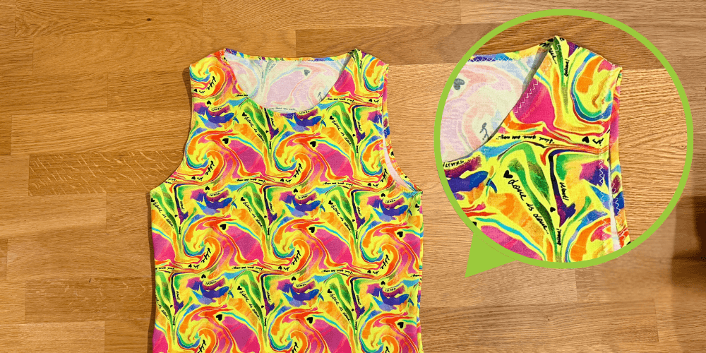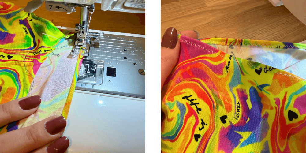Završetke (izrez oko vrata, otvore za ruke i donji rub) preklopimo 0,5 cm prema unutra i prošijemo uskim cik-cak šavom. Na zaobljenim dijelovima materijal lagano rastežemo kako bi lijepo prionuo.