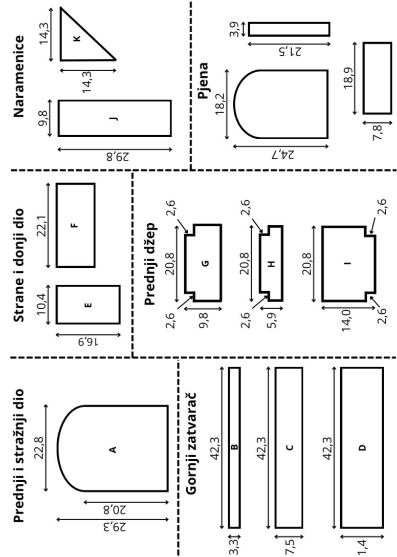 Najprije si prema priloženoj SKICI nacrtamo kroj i zatim izrežemo sve potrebne dijelove tkanine. Sve mjere su navedene u centimetrima i odgovaraju dječjem ruksaku. Ako želiš veći model, jednostavno proporcionalno povećaš mjere i napraviš veličinu koja ti najviše odgovara.