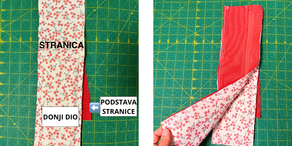 Uzmemo oba dijela tkanine označena slovom B. Zatvarač okrenemo licem prema vanjskoj tkanini i preko njega položimo podstavu. Zatim sve zajedno prošijemo, kao što je prikazano na slici. Kada je šav gotov, tkaninu okrenemo i lijepo zglačamo.