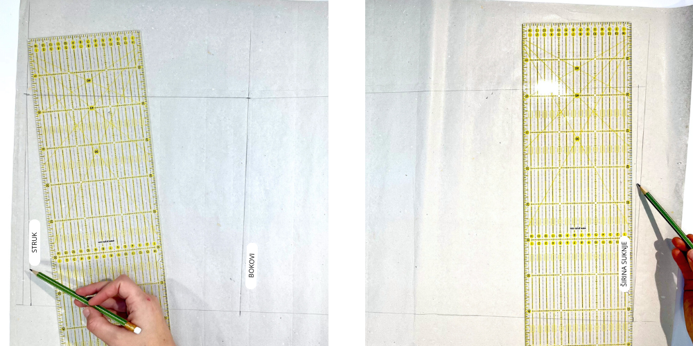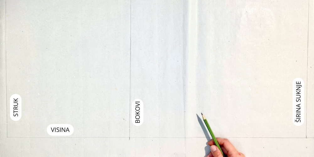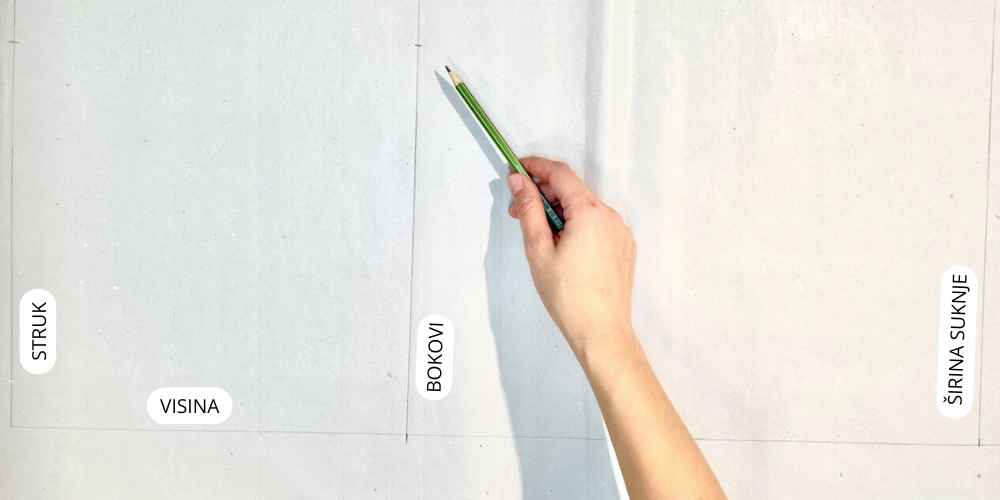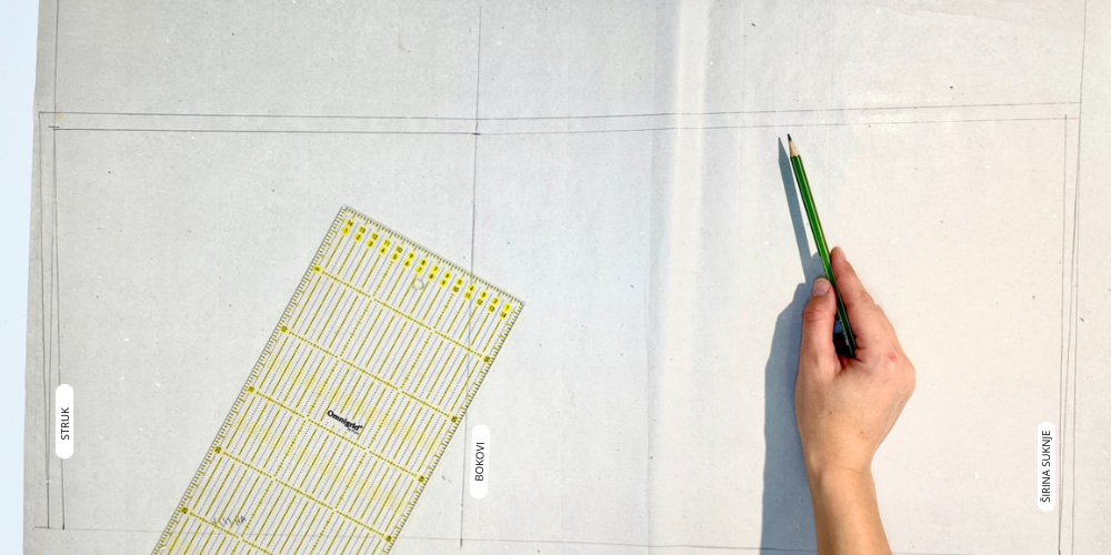 Na vrhu napravimo pravi kut koji će nam biti linija struka, a iz ove linije označimo visinu sjedala. Na ovom mjestu napravimo novi pravi kut koji predstavlja bočnu liniju, a na kraju dužine napravimo još zadnji pravi kut koji je dužina suknje.